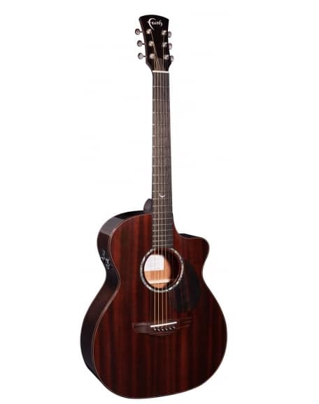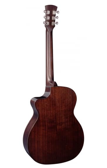 This OM Cutaway design is built from Solid African Mahogany all over, but with the top having gone thru a laborious roasting or ‘torrefaction’ process. The Mahogany is air dried before being roasted in a kiln with precise controls over atmospheric and oxygen levels to reduce its moisture content. Then as the wood cools, precise amounts of moisture are re-introduced to the wood. The resulting timber is more stable – always good when used as a topwood – and aurally, it produces a rich, mellow tone with a mature voicing which would take perhaps 20 years of waiting to achieve under normal circumstances. The Legacy ‘Dark Roast’s’ physical colouration is reflected in its tonal palette too with a luxuriously smooth low-end, pronounced, well-balanced mids, and a treble range with remarkable headroom.